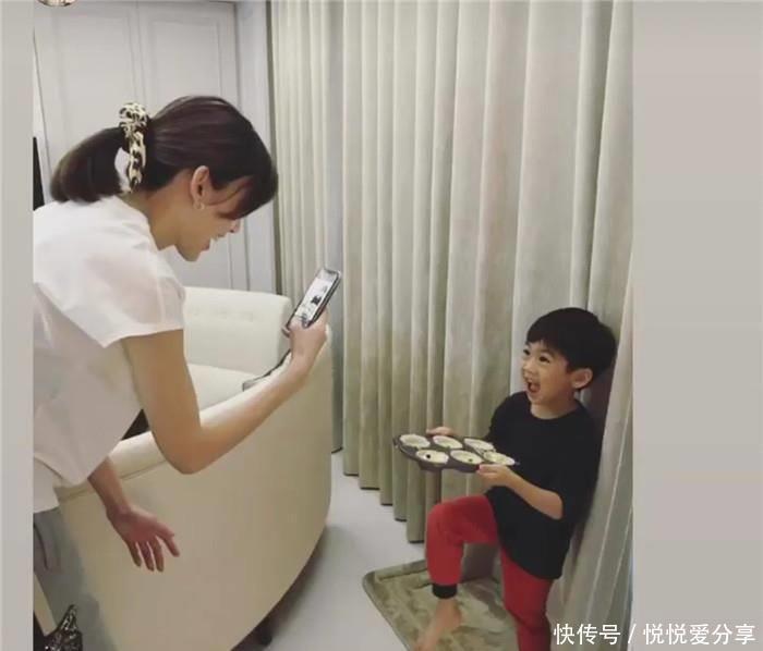 蛋糕作念好后,是两小只的臭好意思本领,陈若仪分散给双胞胎拍照,jenson拿着盘子,站在窗帘前,陈若仪给他拍照,看小家伙多会对着镜头笑啊。凯凯亦然。